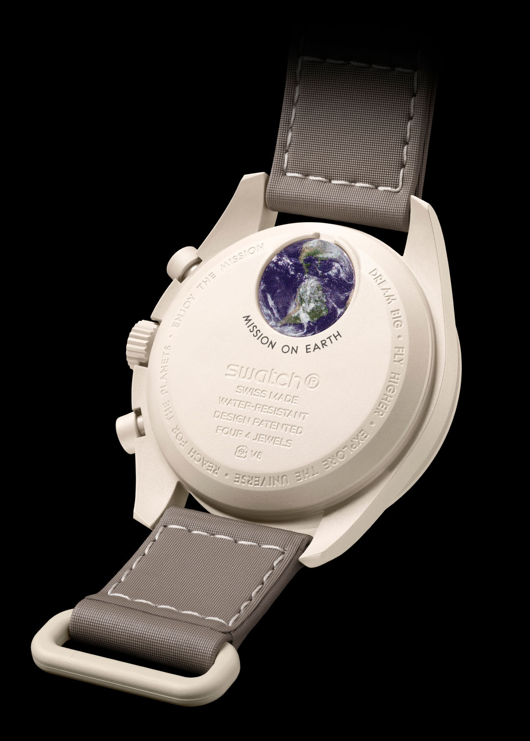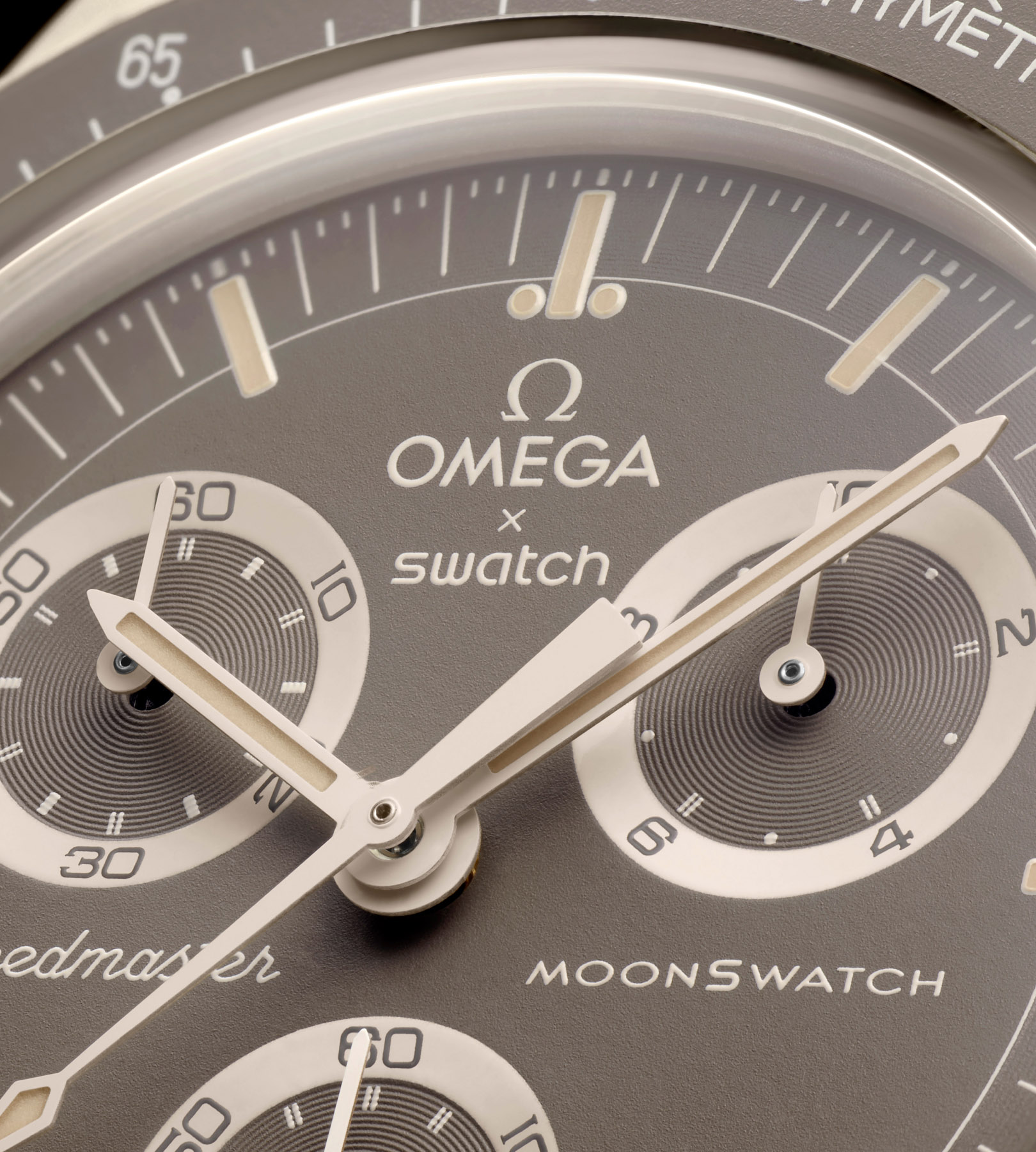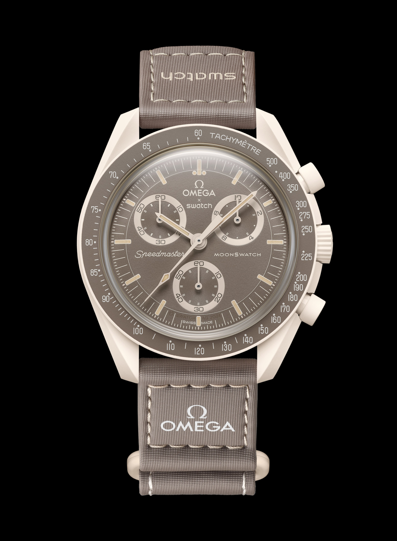 这款非限量腕表采用沙色创新性植物陶瓷 (Bioceramic) 表壳、表冠和按钮,并配备以沙色缝线装饰的灰褐色 VELCRO撞色表带。灰褐色表盘搭配沙色指针。小表盘阿拉伯数字和时标采用放射状设计,致敬了超霸系列“阿拉斯加计划”II 和 III(Alaska II and III)表款。灰褐色表圈带有沙色测速刻度。该系列所有腕表表盘均饰有 OMEGA X Swatch 品牌标志、经典 Speedmaster 标志和 MoonSwatch 标志。所有表款均采用剔透生物源材质盒形表镜,表镜中央巧妙印刻 S 标志,表盘外圈和内嵌小表盘饰以精致圆形图案,时尚夺目的表耳结构,测速刻度上点缀标志性“dot over 90”细节,创新性植物陶瓷材质带来独特的细腻质感。时针、时标、分针以及计时秒针的尖端覆以 A 级 Super-LumiNova 夜光涂层(绿光),身处黑暗亦能清晰读时。